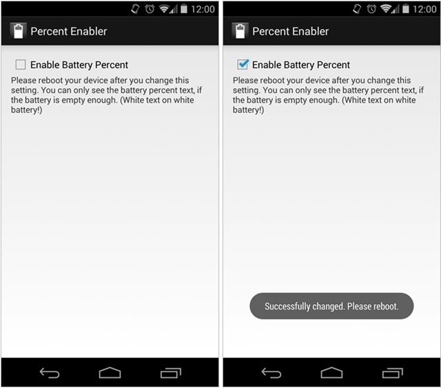 Por algún motivo en esta versión de Android, Google decidió incluir la función, pero de forma un poco oculta. Ya que para habilitarlo fácilmente en el Nexus 5, todo lo que necesitas hacer es descargar este archivo en formato APK e instalarlo en tu gadget como si fuese una aplicación mas. En las opciones de Percent Enabler, solo hay que marcar la casilla “Enable Battery Percent” y reiniciar el gadget para confirmar los cambios.