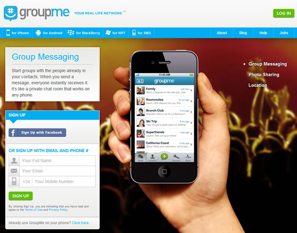 GroupMe es una aplicación multiplataforma podrás utilizarla en un iPhone, Windows Phone, un teléfono con Android, una Blackberry o cualquier otro Smartphone. GroupMe nos da la posibilidad de compartir mensajes, fotos, realizar llamadas de conferencia a un grupo.
