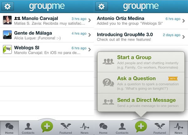 Aparte de todas las funciones anteriores (multiplataforma, geolocalización en Google Maps, llamadas de voz a grupos, envío de fotos) GroupMe cuenta con las siguientes novedades.