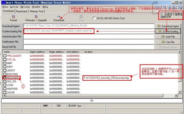 - Después de abrir el archivo MT6577_Android_scatter_emmc.txt te mostrara una serie de archivos, donde solo tendras que marcar RECOVERY, y verificar que la ruta es la correcta.